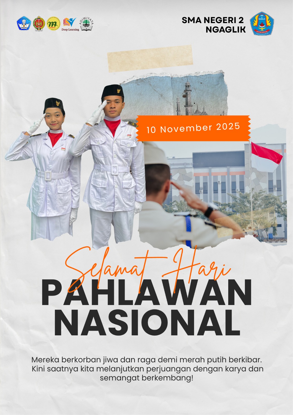 Mari seluruh warga SMA Negeri 2 Ngaglik menjadikan Hari Pahlawan sebagai sumber inspirasi untuk terus berkarya, berinovasi, dan berkontribusi bagi bangsa. Pahlawan telah menunaikan tugasnya, kini saatnya kita meneruskan perjuangan dengan semangat yang sama, berani, tangguh, dan berjiwa besar.